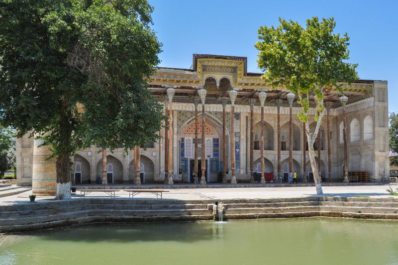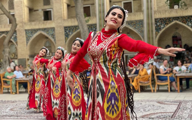 Snídaně a odjezd vlakem do Buchary. Buchara má více než 2500 let starou historii, je to pozoruhodné město, které uchvátí každého návštěvníka. Prohlídku zahájíme u komplexu Lyabi Hauz ze 17. století, který se rozprostírá u ornamentální vodní nádrže. Tyto bazény sloužily k zásobování města pitnou vodou a v Buchaře jich bylo až 80. (Hauz = v uzbečtině vodní nádrž, bazén). V Buchaře nelze vynechat krytý bazar, kde nabízejí svoje výrobky zlatníci, prodejci čepic, tradičních kabátů a dalšího bucharského zboží. Buchara je též proslulá hedvábím, které je zpracováno do luxusních výrobků, které nabízejí vyhlášené obchody v kupeckých domech. Ubytování v hotelu, folklórní představení a večeře v restauraci, nocleh.